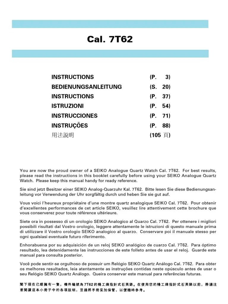 Hi, that watch is a 7t62 caliber. To measure the hourly average speed of a vehicle. Push back in to normal position. For best results, please read the instructions in this booklet carefully before using your seiko analogue quartz. Tachymeter scale can be used only when the time required is less than 60 seconds.